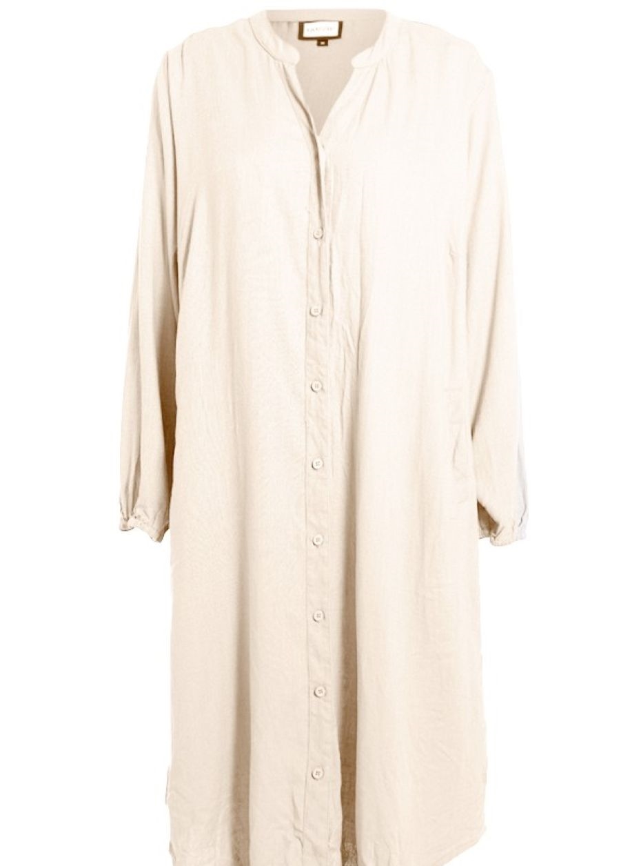 Flot skjortekjole i 70% jersey viskose og 30% hør fra Gozzip. Enkelt snit i en luftig model. Kjolen er med V-hals og gennemknappet. Læg i ryggen. Skrå lommer foran. Med rummelig pasform og en god længde, som gør den komfortabel i hverdagen og til en uformel anledning.