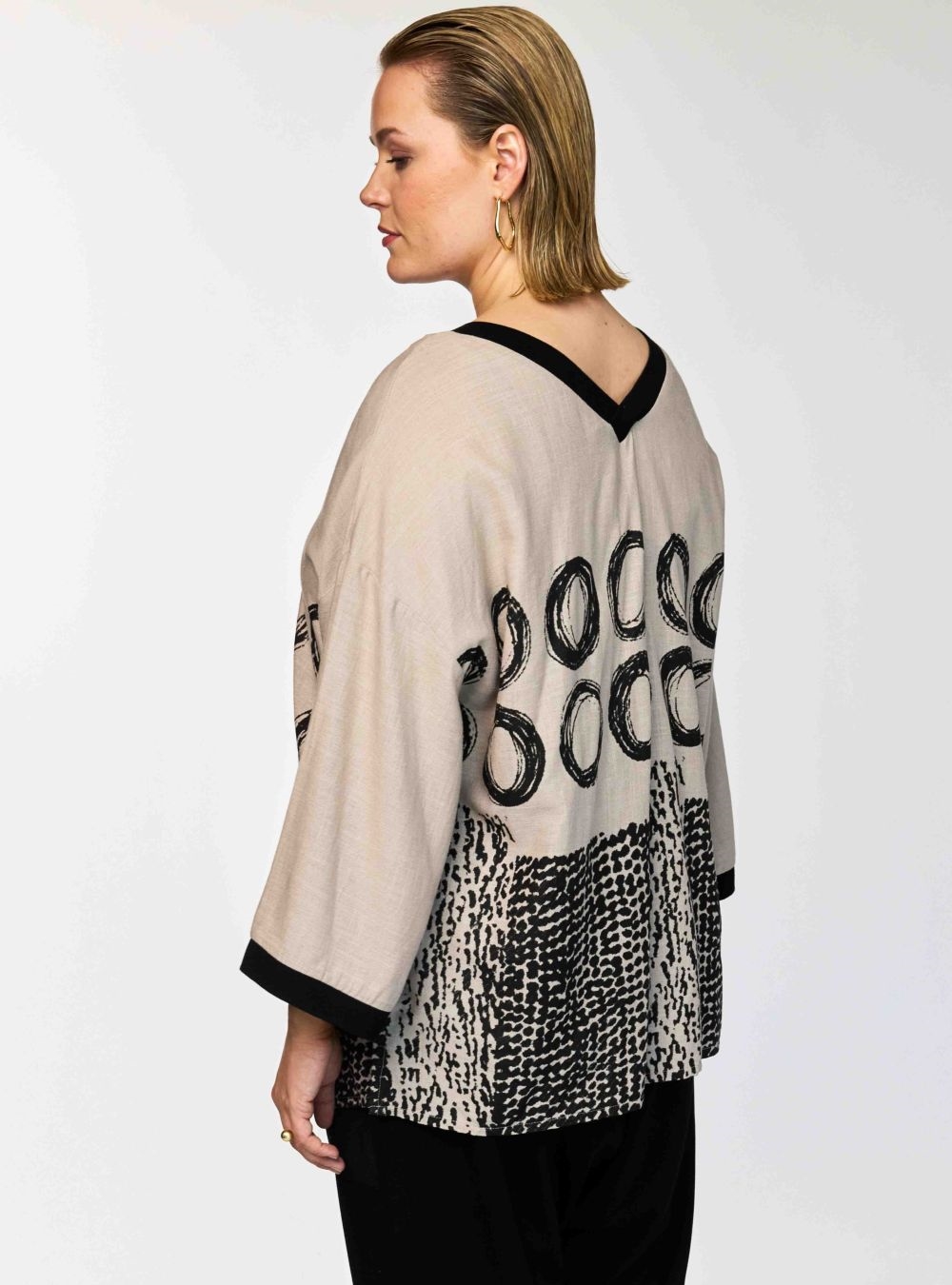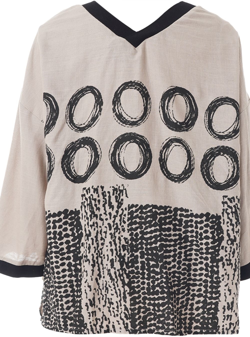 Let og luftig bluse med V hals fra Gozzip Black. Blusen er Beige med 3/4 ærmer og smart Sort print.