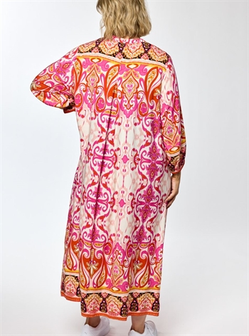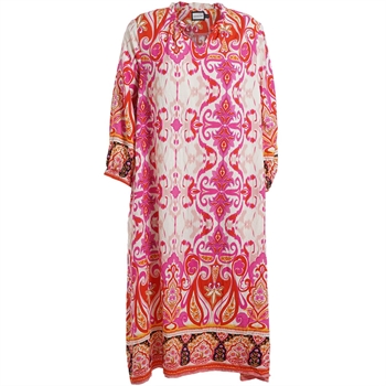 Skøn kjole med A-facon fra Gozzip. 3/4 ærmer og V-hals. Smuk print i Pink farver med en flot bort nederst på kjolen og ærmerne. Læg bagpå, så den falder flot i A.