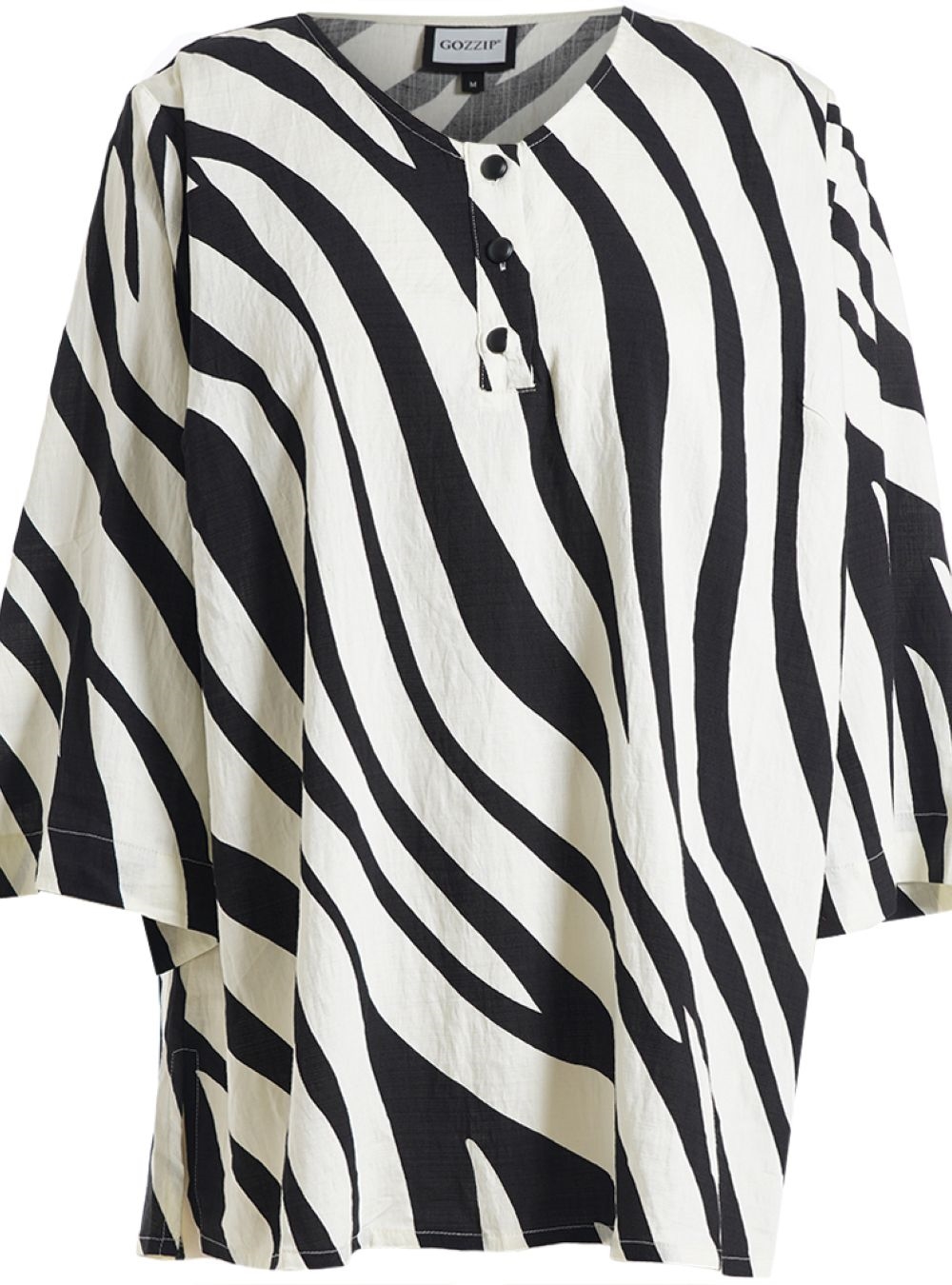 Let og luftig bluse med let A-facon fra Gozzip. 3/4 ærmer, V hals og 3 knaps lukning.
