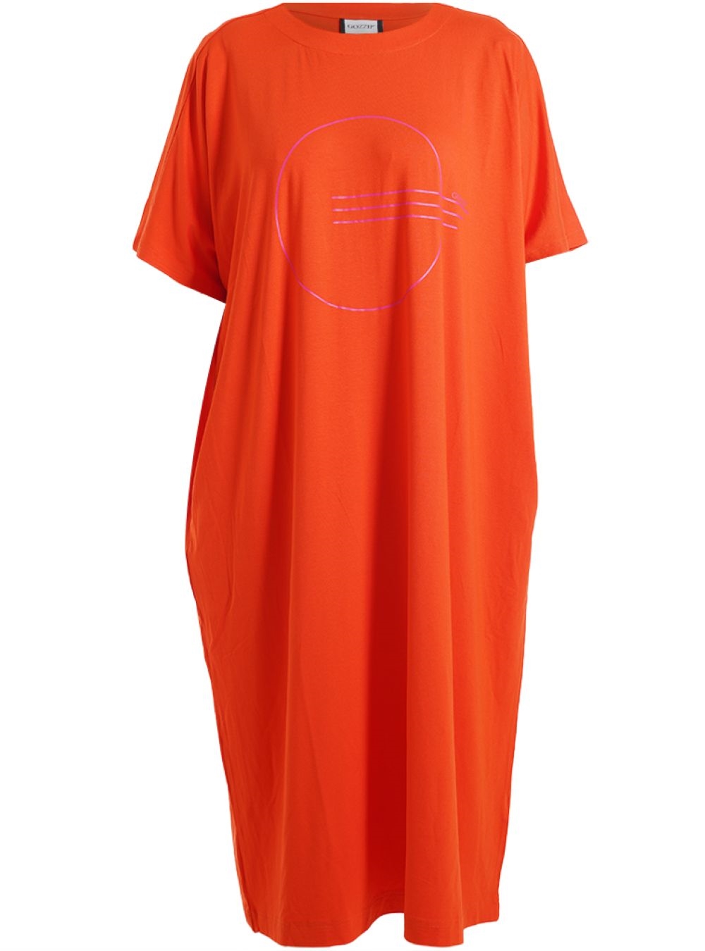 Flot kjole i jersey viskose med print fra Gozzip. Rund hals. Kjolen har en rummelig pasform og har en god længde, som gør den komfortabel i hverdagen. Pep den op med sandaler.